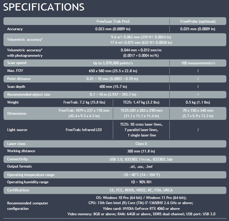 o FreeScan Trak Pro2: 0.023 mm (0.0009 in)